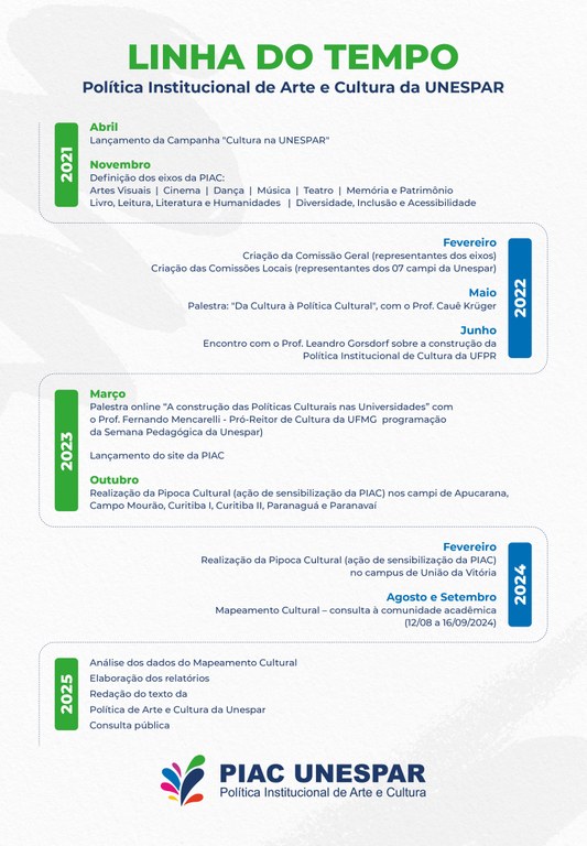 Em março de 2023, como parte da programação da semana de recepção dos calouros, foi realizada a palestra online “A construção das Políticas Culturais nas Universidades” ministrada pelo Pró-Reitor de Cultura da UFMG, prof. Fernando Mencarelli. Juntamente com esta atividade, foi lançada a página da Política Cultural da Unespar, uma ferramenta digital de registro e divulgação de todas as etapas deste processo de criação.